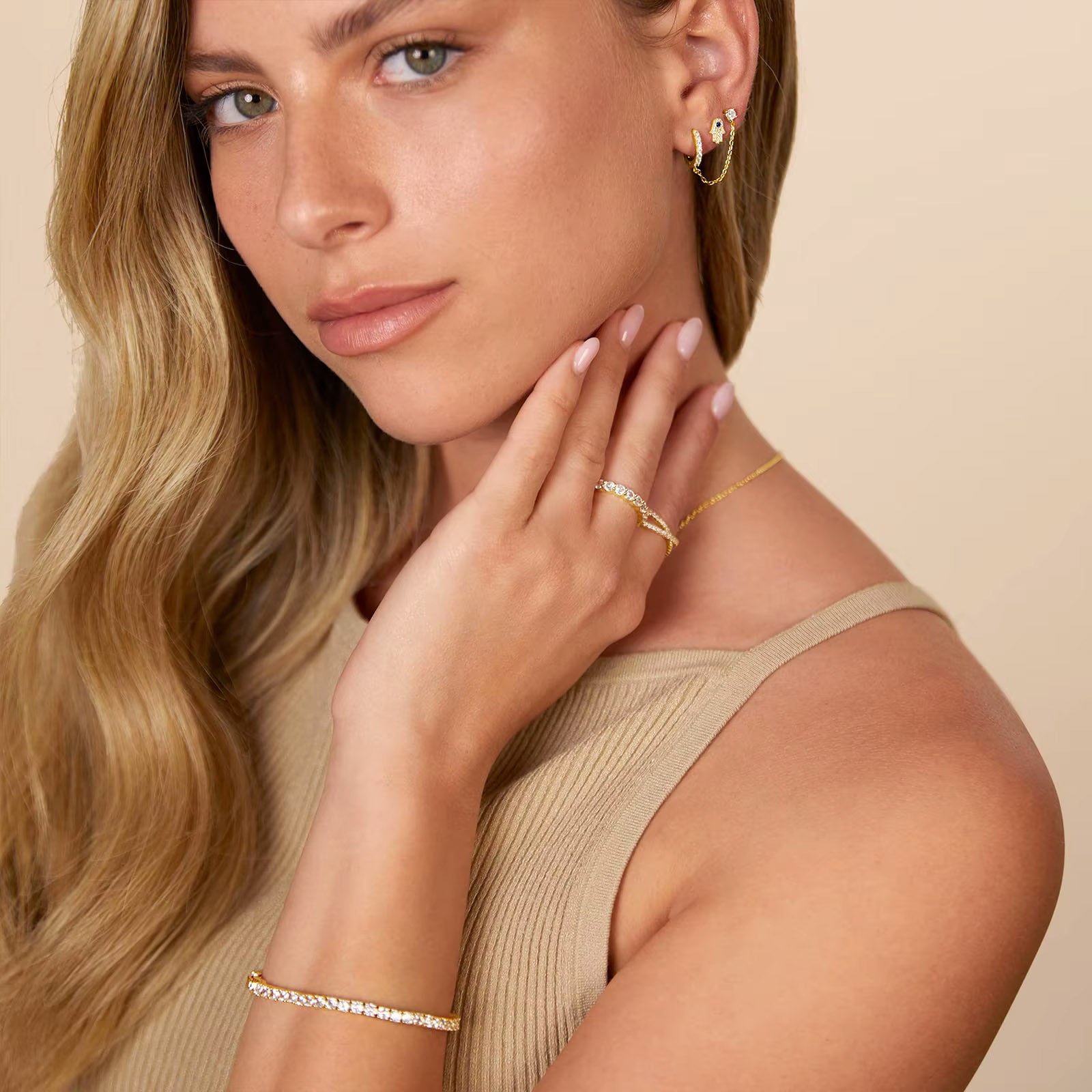 Kedjeörhänge med kedja, där ett klassiskt stiftörhänge binds samman med en hoop. Tillverkat av äkta sterlingsilver och dekorerat med klara stenar som ger extra lyster. En stilren men distinkt detalj för dig som vill sticka ut. Obs säljs som singelörhänge!