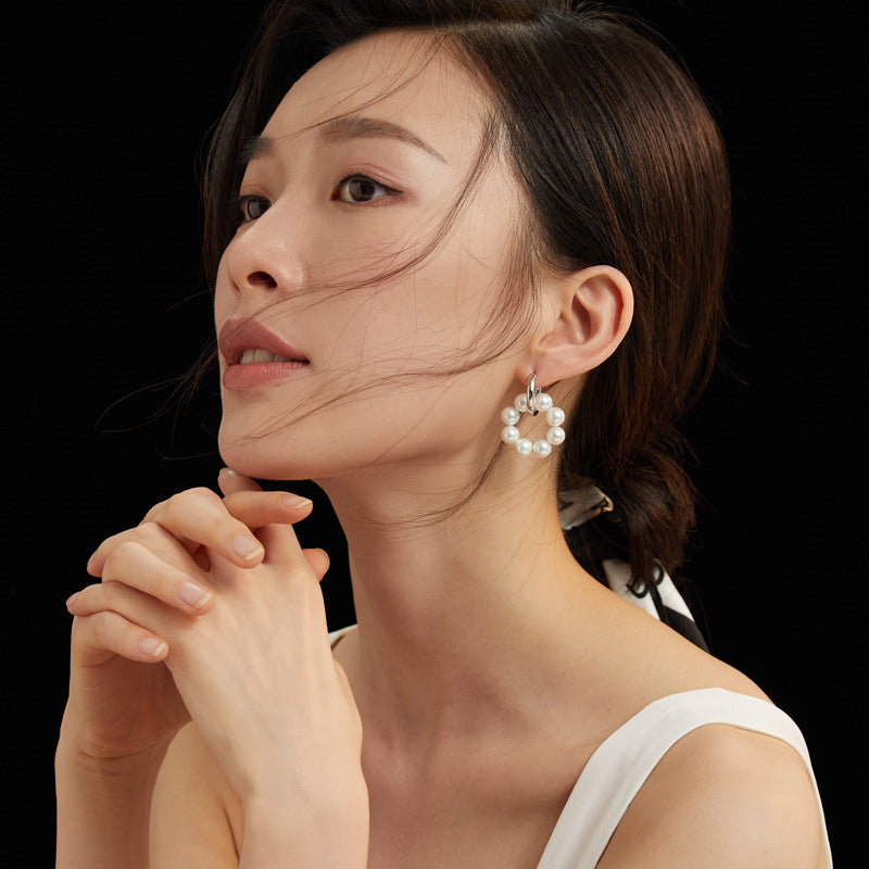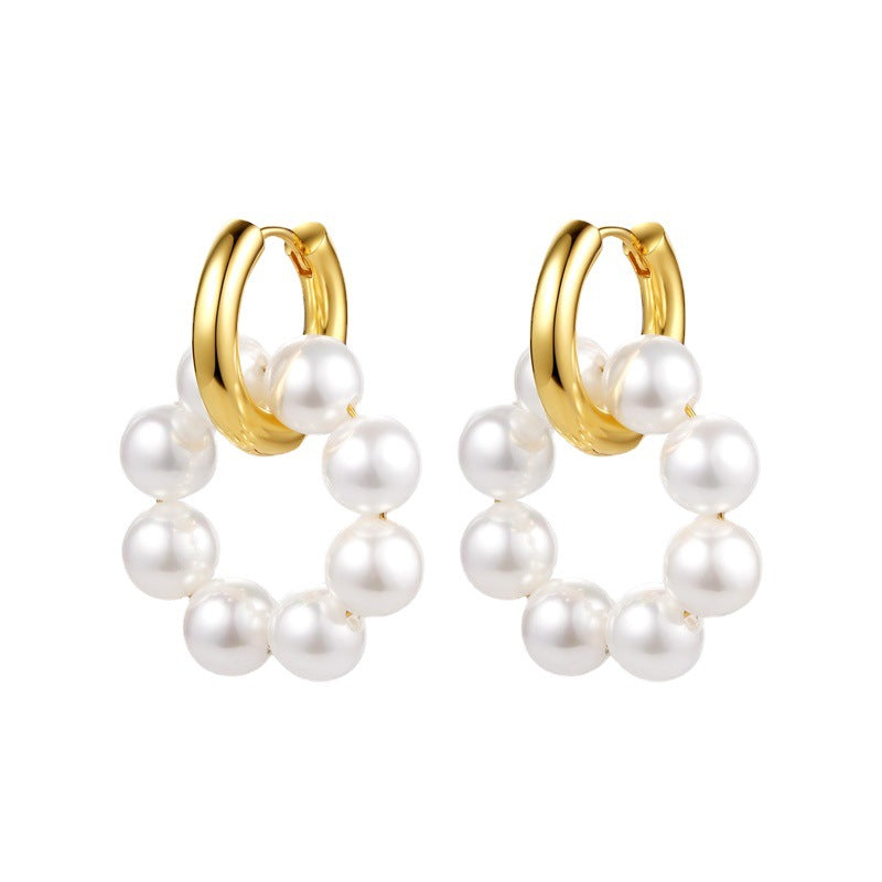 Hoops i guldpläterad koppar med hängande cirkel av syntetiska pärlor. En modern tolkning av klassiska pärlörhängen. Lätta att bära – passar lika bra till vardag som till fest.